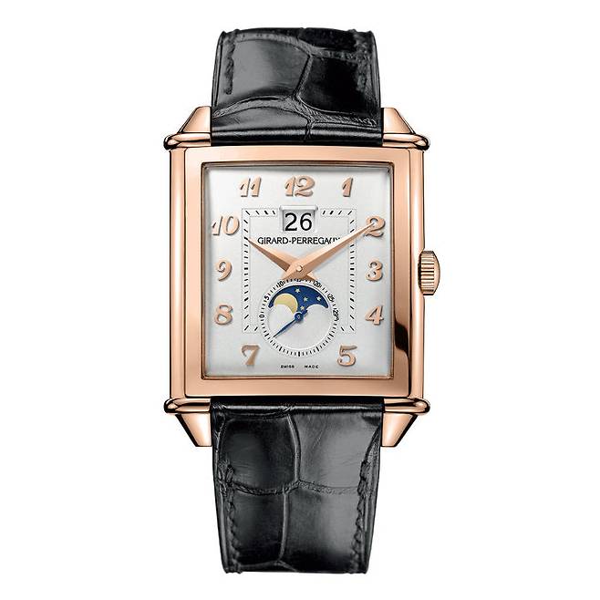 최근 빈티지 시계에 대한 관심이 높아지면서 과거 매뉴팩처의 아카이브를 바탕으로 새롭게 출시되는 복각 모델들이 늘어나고 있는데요. 지라드 페리고의 빈티지 1945 시리즈 역시 이런 경향을 반영하고 있습니다. 이름처럼 40년대 출시한 모델의 재해석한 모델이며, 아르 데코 분위기가 물씬 풍기는 독특한 사각 케이스가 특징으로 위에 소개한 예거 르쿨트르의 리베르소 케이스와 비슷한 느낌을 가졌습니다. 오늘 소개하는 골드 케이스의 문페이즈 모델 뿐만 아니라 스틸 케이스, 쓰리 핸즈 모델, 투르비용, 크로노그래프, 여성용 등 다양한 모델들로 컬렉션을 구비하고 있습니다.