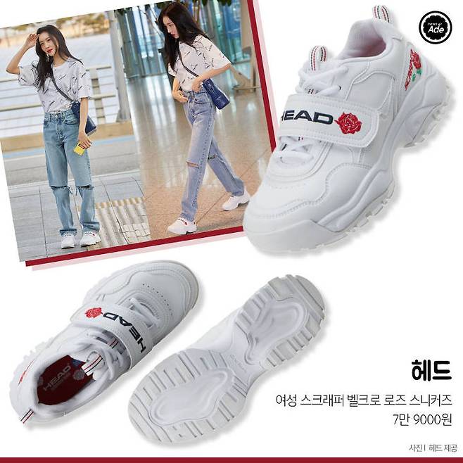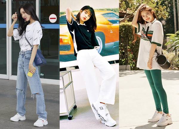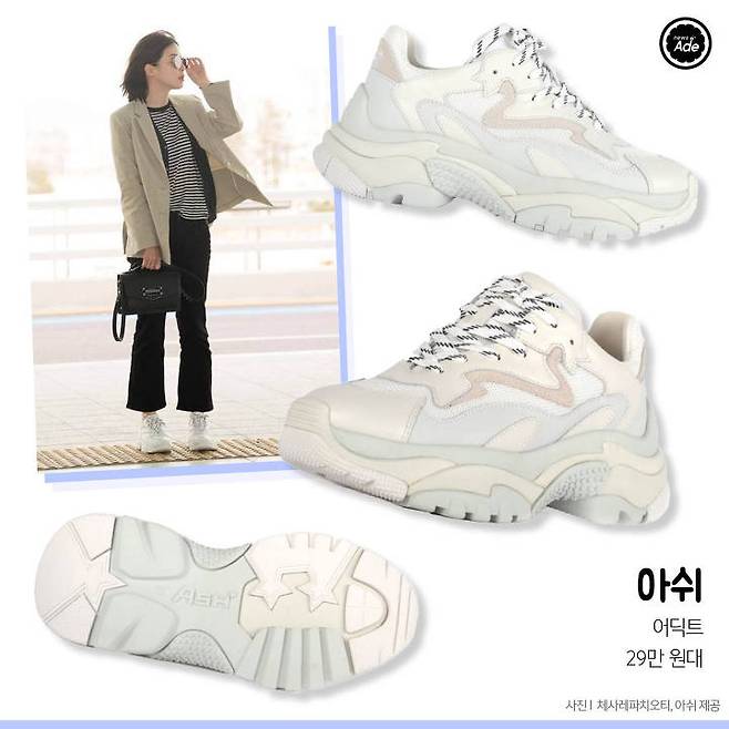 역시 투박하고 널찍한 아웃솔이 특징이며 현란한 배색이 더해져 디테일이 살아 있는 데일리룩을 연출해준다. 현아처럼 믹스매치룩을 즐기는 편이라면 심플한 화이트 톤의 슈즈가 매치하기엔 한결 편안할 것!