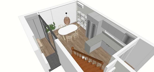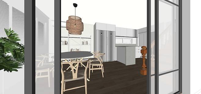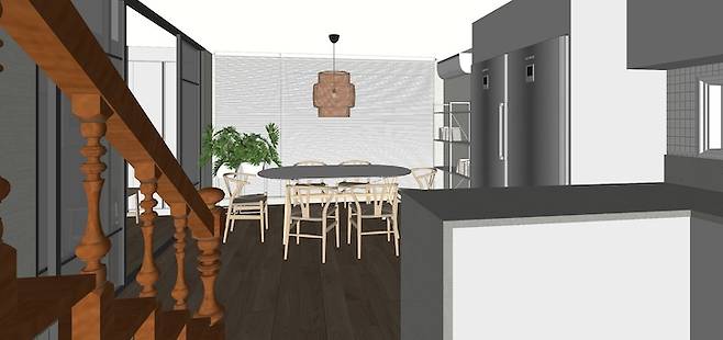 직업이 직업인지라 공간 별로 완성된 이미지를 스케치업으로 미리 구상해봤어요. 저는 과하게 꾸며지지 않은 편안하고 따뜻한 공간을 만들고 싶었는데요, 왜 갖고 있는 물건을 보면 그 사람의 취향을 알 수 있다고 하잖아요. 제게 있는 물건들을 보면 대부분 심플하고 내추럴한 것들이 많아서 그런지 리모델링 계획한 이미지를 봐도 전체적으로 편안한 톤의 공간이 나왔어요.