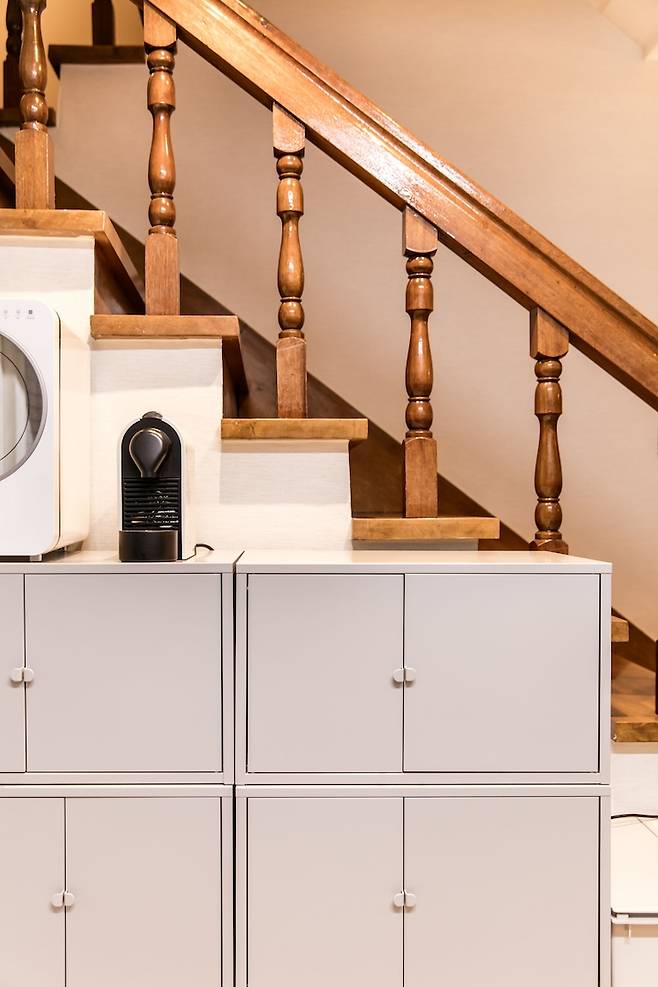 그리고 주방은 상판 인조대리석과 이어지는 싱크대 뒤 턱을 조금 높게 디자인 했어요. 아무래도 타일은 메지에 때가 끼기도 하니까 음식물이나 물이 많이 튀는 높이까지는 인조대리석을 높여두는 게 관리가 쉬울 것 같았거든요. 디자인적으로도 익숙하게 보이는 비율이 아니라 다른 싱크대들과 조금 다른 느낌이 나는 게 좋아요.
