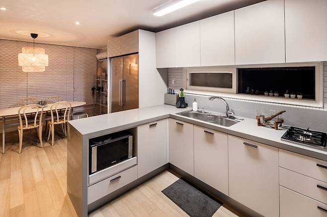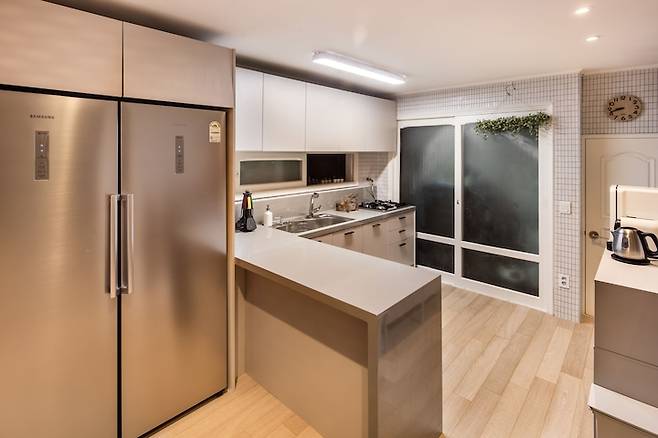 ㄱ자로 아일랜드를 만들고 이 공간을 작업대로 사용할 수 있도록 했어요. 그리고 요즘은 냉장고가 다 깊게 나오잖아요. 그래서 주방 인테리어를 할 때면 냉장고가 툭 튀어 나오는 게 항상 보기 싫다고 생각했어요. 그래서 전 깊이가 얕은 냉장고를 찾았죠. 이건 모듈 냉장고라서 손잡이 방향도 바꿀 수 있고 나중에 김치냉장고를 추가하더라도 똑같은 디자인으로 배치 할 수 있어서 마음에 들어요.