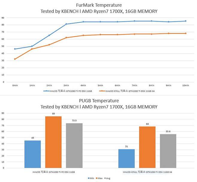 쿨링 솔루션에 따른 발열 제어 능력을 확인하기 위해서 Inno3D 지포스 GTX1080 Ti FE D5X 11GB 레퍼런스 모델과 레퍼런스 기판으로 만들어진 Inno3D iChiLL 지포스 GTX1080 Ti D5X 11GB X4 모델을 비교했다.