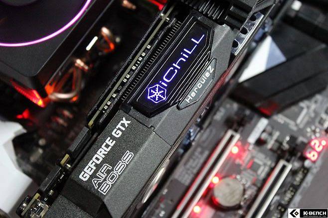 반면, Inno3D iChiLL 지포스 GTX1080 Ti D5X 11GB X4 모델은 동일한 기판 구성이지만 92mm 트리플 쿨링팬과 전원부 발열 해소를 위한 50mm 쿨링팬을 탑재했으며, 그래픽카드 전체를 감싸는 두껍고 커다란 히트싱크는 다양한 히트파이프로 구성되어 있다.