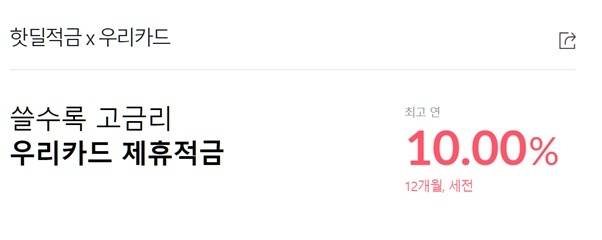 최근에는 우리카드와 결합하여, 제휴적금 가입 후 만기 전전월 말까지 지정카드로 240만원 이상 실적을 쌓을 경우 최고 연 10.00%(!)(12개월, 세전, 월 20만원 한도), 제휴 적금 가입 후 익익월 말까지 지정카드로 20만원 이상 실적을 쌓을 경우 최고 연 8.50%(12개월, 세전, 월 20만원 한도), 까지 이율이 적용되는 그야말로 ‘핫딜적금’을 선보이기도 했죠.