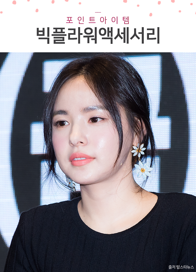 큰 사이즈의 플라워 귀걸이으로 포인트를 더했어요.