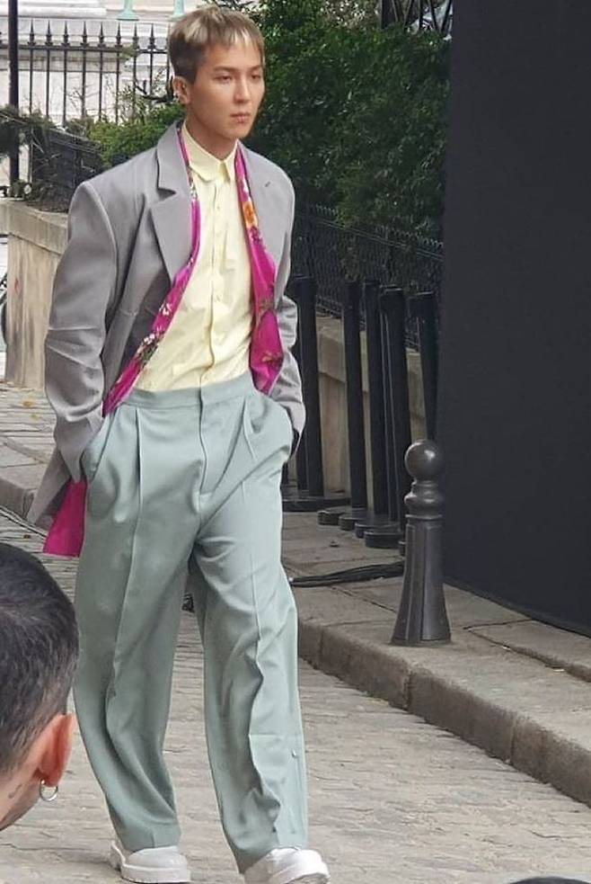 송민호는 페일 옐로 셔츠에 민트 컬러 와이드 팬츠와 오버사이즈 그레이 재킷으로 구성된 파스텔 슈트룩을 선보였다.