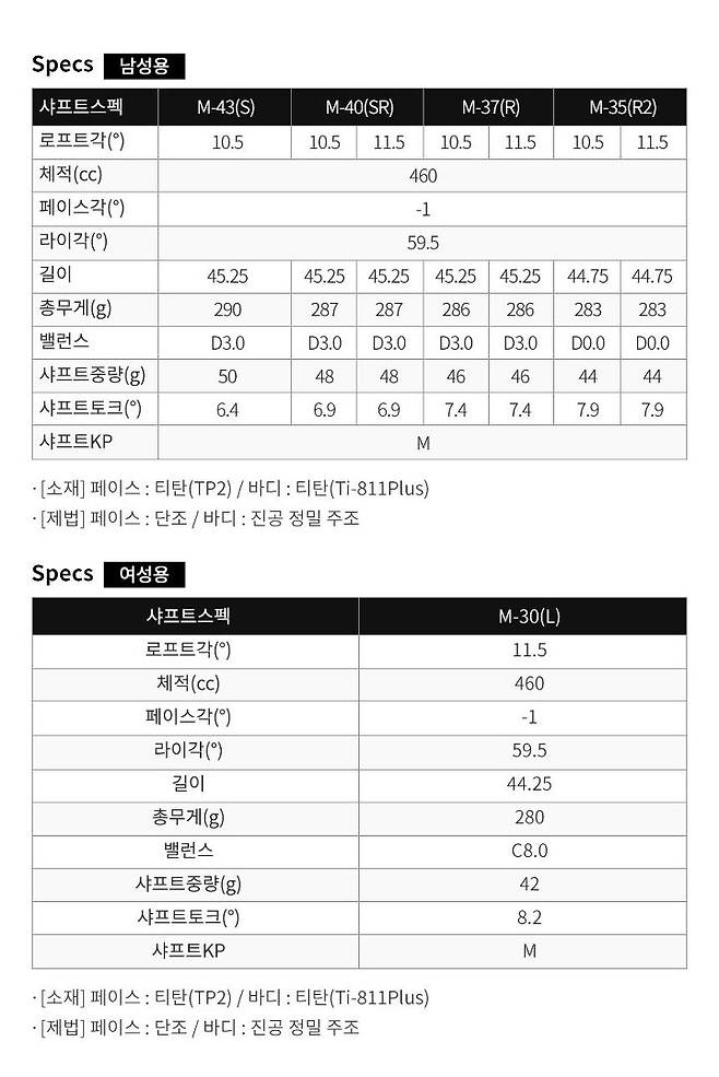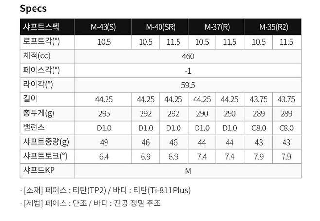 해당 모델은 샤프트 스펙 M-40(SR)로 로프트각 10.5도, 길이는 45.25, 8.2의 토크, 무게도 287g이라서 상당히 가벼운데, 고급 소재에만 사용되는 티타늄을 적극 채용하였습니다.