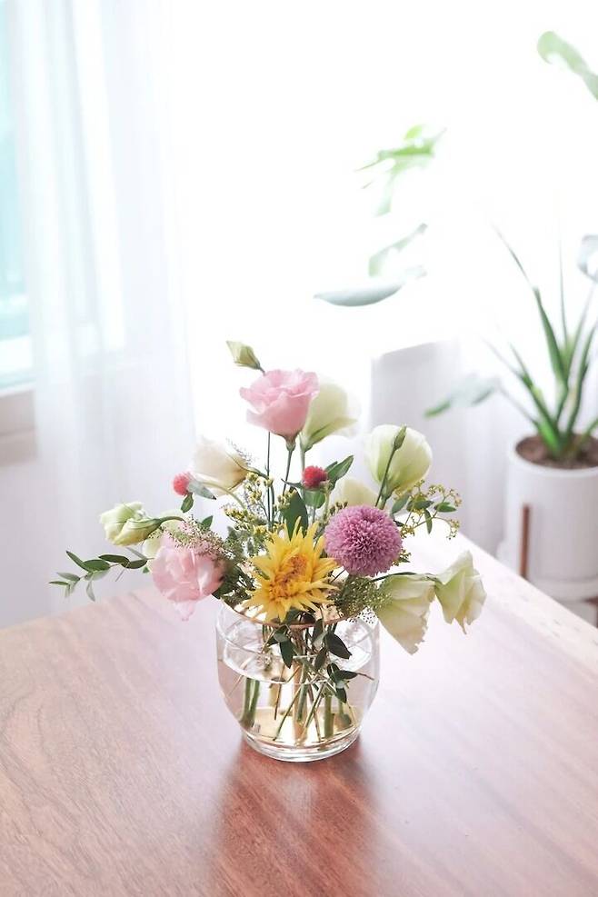 서양 꽃꽂이로도 연출할 수도 있지만, 생각보다 예쁘게 연출하기 어려웠어요. 선을 잘 생각해서 꽂아야 하는데 생각보다 쉽지가 않아요. 동양 꽃꽂이의 영향을 받은 형태라 그런 것 같아요.