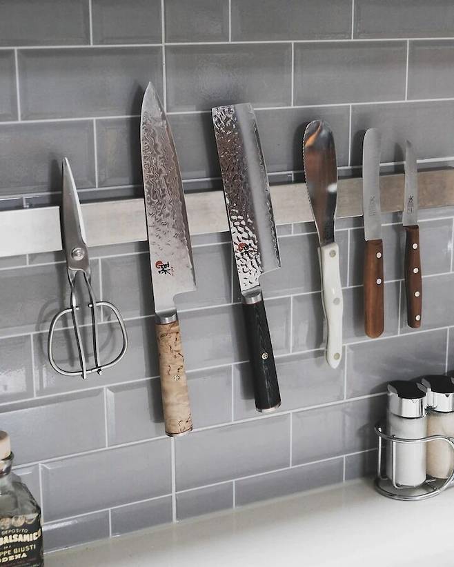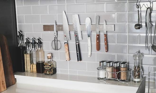 가장 자주 사용하는 조리대의 벽면에 부착해두니 원하는 칼을 바로 쓸 수 있다는 장점도 있습니다. 저는 칼이 몇 개 없지만, 칼을 여러 개 가지고 계신 분이라면 이 장점을 더욱 공감하실 것 같습니다. 칼세트를 쓰면 손잡이 디자인이 비슷해서 어떤 칼날인지 확인을 해봐야 할 때가 있거든요.