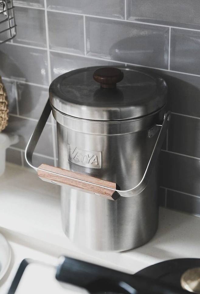 그래서 음식물 쓰레기통도 스테인레스로 된 것을 사고 싶었는데, 마침 오늘의집에서 밧드야 음식물 쓰레기통을 팔더라구요. 손잡이 부분이 원목으로 되어있어 저희집 분위기와도 잘 어울렸기에 고민없이 샀습니다.
