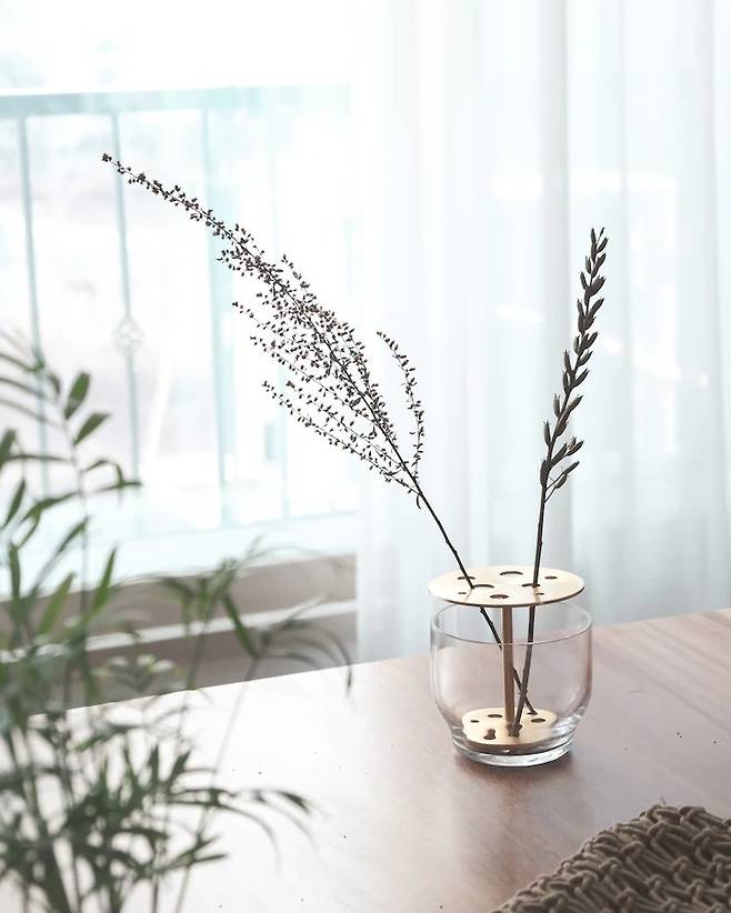 침이 없어도 꽃을 세워서 꽂을 수 있기 때문에 하나만 꽂아도 멋스럽게 표현할 수 있어요. 긴 나뭇가지도 쉽게 꽂을 수 있습니다. 겨울 분위기를 내고 싶어서 집 밖에 널려있는 쑥과 달맞이꽃의 마른 가지를 꺾어다가 꽂아 봤어요.