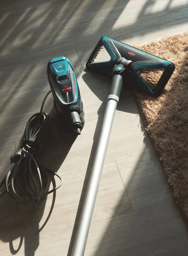 별 하나를 빼게 만든 단점은 바로 유선이란 겁니다. 고온 스팀을 뿜는 청소기라서 어쩔 수 없이 코드를 꽂아서 사용해야 하는데요. 무선 청소기와 무선 물걸레 청소기에 익숙해져 있던 터라 유선인게 굉장히 불편하게 느껴졌습니다. 선이 굉장히 길어서 이동에 큰 방해를 받는 건 아니지만 그래도 불편했어요.