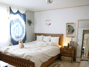 커튼까지 달아주니 인테리어가 완성된 느낌이 나서 볼 때마다 기분이 좋더라고요. 은은하게 들어오는 햇살에 자연스럽게 깨는 걸 좋아하는 저에겐 잘 맞는 커튼이에요.