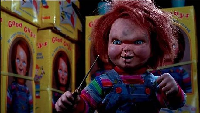 가장 귀여운 연쇄살인마, 인형의 몸에 갇힌 싸이코 ‘사탄의 인형’의 처키입니다. ‘사탄의 인형’ 역시 ‘할로윈’과 마찬가지로 슬래셔 장르의 간판 시리즈이기도 한데요. 하지만 처키의 집요함은 보다 대단합니다. 바로 처키의 메인 타겟이 어린 아이이기 때문이죠. 그 이유는 처키가 자신의 영혼을 인형의 몸에서 사람의 몸으로 옮겨야 하는데, 이 대상이 자신의 존재를 처음 알린 사람, 즉 인형의 주인인 6살짜리 꼬마이기 때문입니다. 죽여도 죽여도 되살아나서 어린 아이를 쫓는 살인마라니, 살벌하죠.