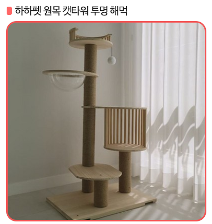 캣타워에 투명 해먹이 함께 세트로 된 상품으로 가성비가 좋은 제품입니다. 투명 해먹은 아래에서 고양이의 발바닥 젤리를 볼 수 있어 집사들에게 인기가 많죠.