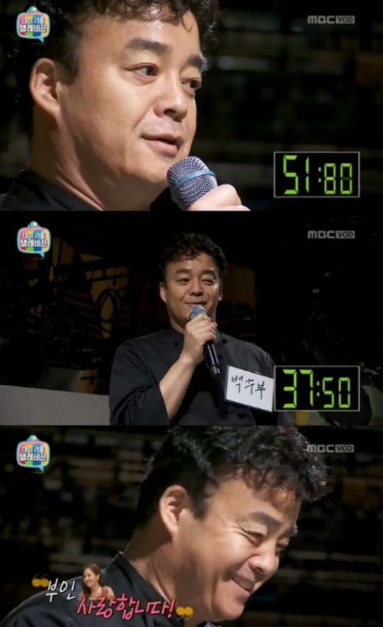 백종원은 마리텔 1등 수상으로 1분 동안 홍보할 수 있는 기회가 주어졌습니다. 공중파 황금 시간대에 대단히 큰 상이군요! 아내에게 사랑한다고 고백하기도 했죠.