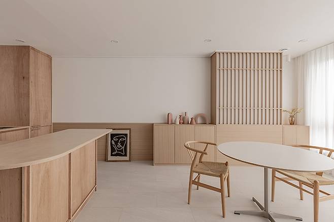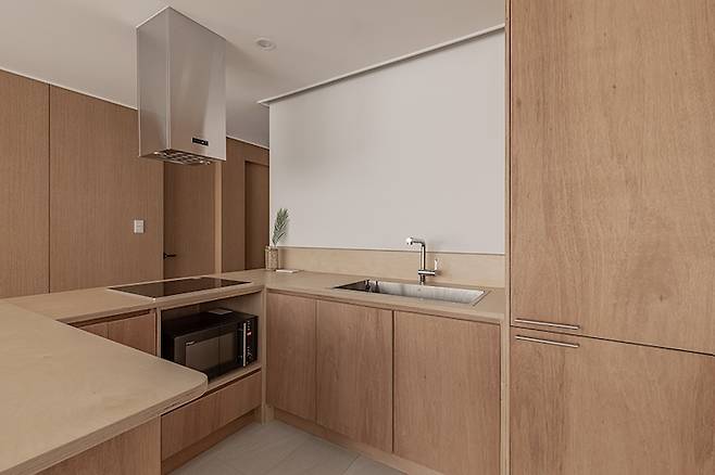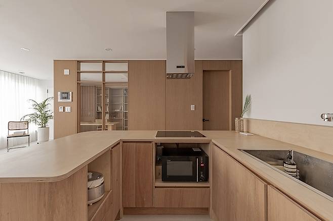 ↑주방을 많이 활용하지 않아 주방 합판 마감으로 제작하며 싱크대를 곡선으로 두어 부드러운 분위기로 연출