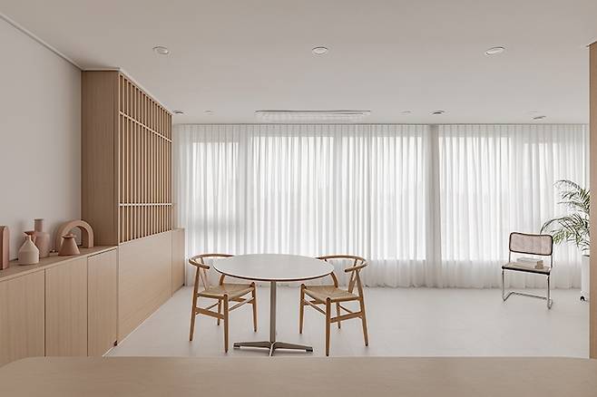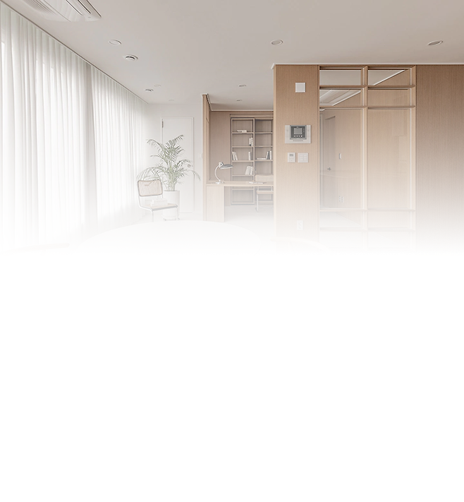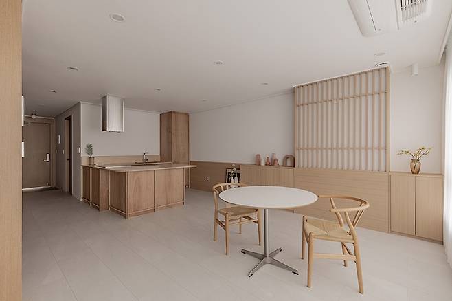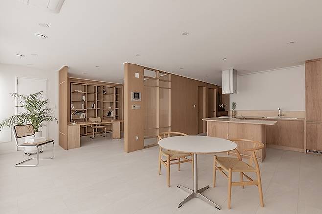 - 기존 거실 느낌과 다르게 쇼파와 TV 없는 공간으로 한지 아크릴과 우드톤의 격자패턴의 창을 디자인하여 서재와의 무드를 맞춤