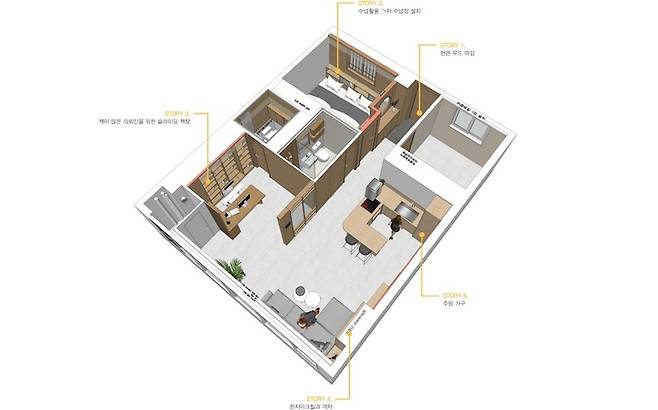 -공간이 좁아 상부에는 덧벽을 치고 하부엔 수납장을 깊이 두어 공간활용