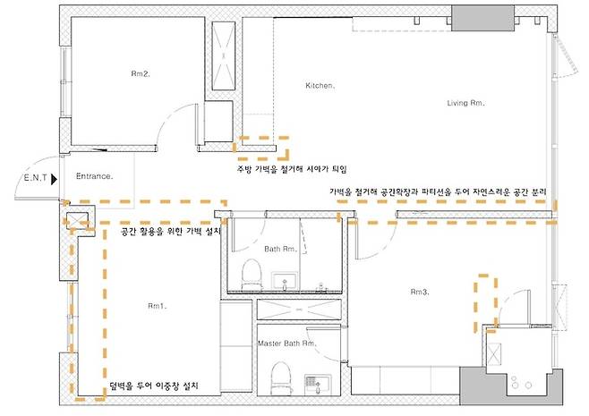 - 기존 안방이었던 공간을 확장하여 오픈된 서재공간, 파티션을 두되 복도라인과 동일한 마감으로 자연스러운 공간 분리