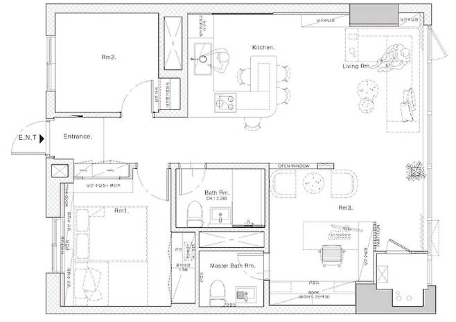 -한쪽 벽면 전체를 우드로 마감하여 차분하며 안방과 연결된 벽에 원형 창을 두어 답답하지 않는 공간으로 구성