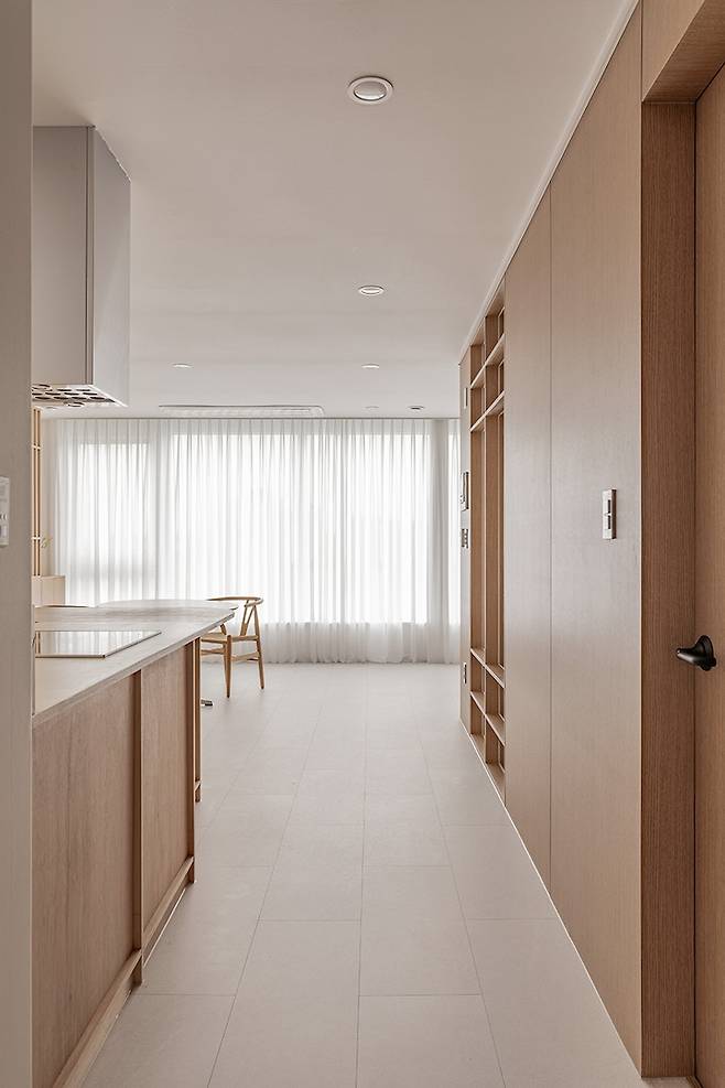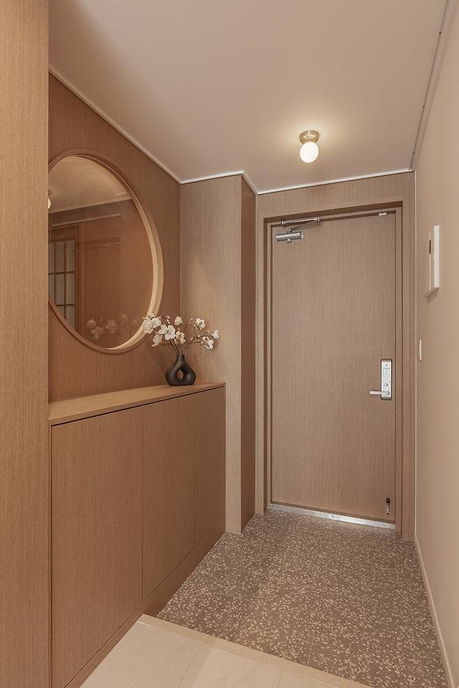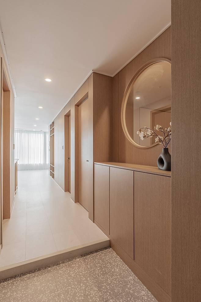↑현관에서부터 복도까지 연결된 우드톤이 따뜻한 분위기를 연출