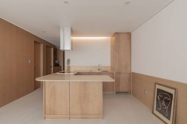 - 주방 싱크대와 빌트인 냉장고까지 같은 우드 마감으로 통일