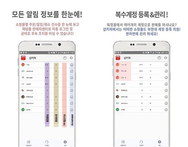 온라인 쇼핑몰 홍수 속에서 살아남으려면 누구보다도 부지런해야 한다. 매일 주문건수를 확인하고, 소비자의 문의사항에 귀 기울여 빠르게 응대해야 한다. 하지만 여러 오픈마켓에 입점해 상품을 판매하다 보면 이러한 일들이 마음먹은 것처럼 잘 되지 않는데, 이때 샵키퍼를 이용하면 여러 오픈마켓의 상황을 한눈에 확인할 수 있어 보다 빠른 응대가 가능하다. 다양한 오픈마켓에 입점돼있는 쇼핑몰을 운영하고 있다면 한 번쯤 눈여겨볼만한 앱이겠다.