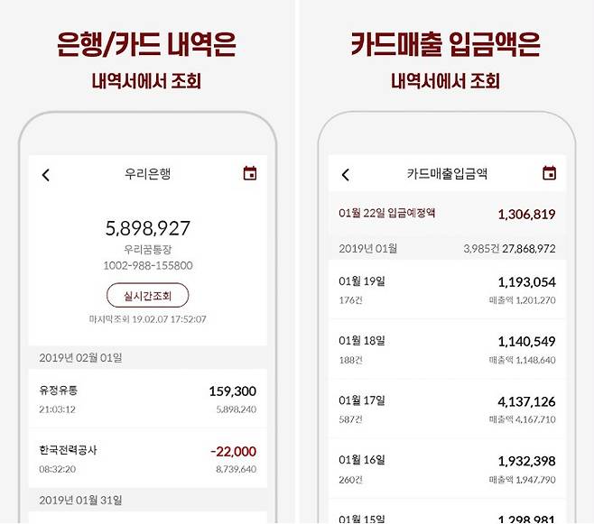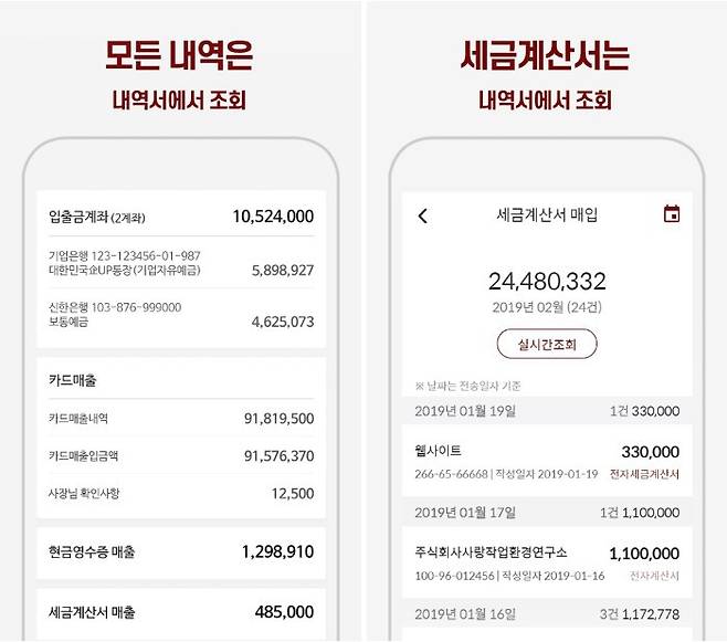 > 입출금계좌와 카드매출, 현금영수증 매출, 세금계산서 매출 관리가 가능하다