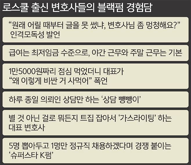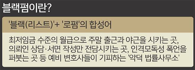 블랙펌의 정의가 명확히 있는 건 아니다. 청년 변호사들이 ‘불합리하다’고 느끼는 곳은 모두 블랙펌으로 분류된다. 주로 최저임금 수준의 월급으로 주말 출근과 야근을 밥 먹듯이 시키는 곳, 의뢰인 상담·서면 작성을 전담시키는 곳, 인격모독성 발언을 하는 곳 등이 꼽힌다.