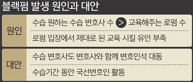 11일 법조계에 따르면 대한변협은 200명 제한을 둔 실무연수를 지난 7일 시작했다. 이번 실무연수엔 취업에 성공하지 못한 545명의 10회 변호사시험 합격자가 지원했는데, 이 중 345명은 추첨에서 떨어졌다. 345명에겐 한 가지 선택지만 남았다. ‘어떻게든 수습처를 찾을 것’. 6개월 수습 기간을 채우지 못하면 정상적인 변호사 활동을 못하기 때문이다. 마음이 급한 이들은 지푸라기라도 잡는 심정으로 자신을 받아줄 수습처를 찾아 헤맬 수밖에 없다. 그러다 보면 ‘울며 겨자 먹기’식으로 블랙펌도 감수하고 들어가게 된다. 예전부터 그랬지만 올해는 더 많은 변시 합격자가 실무연수 길이 막혀 블랙펌으로 몰릴 것이란 전망이 나온다.