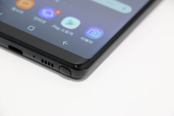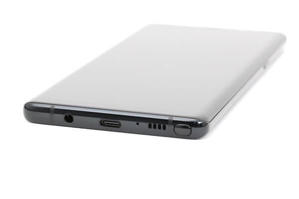 하단에는 3.5mm 이어폰 단자와 USB 타입C 포트, 음성통화용 마이크 홀과 스피커가 일렬로 늘어서 있으며, 오른쪽 끝에는 갤럭시노트 시리즈만의 특장점인 S펜이 보인다.
