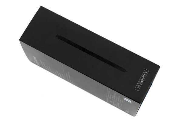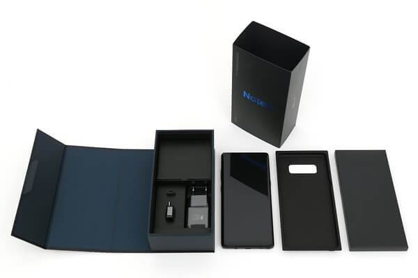 삼성 갤럭시노트8의 박스 패키지는 요즘 유행하는 종이 재질의 무광 블랙이다. 삼성은 한동안 자사의 플래그십 시리즈에 화이트 박스를 사용하다가 지난해 3월 출시된 갤럭시S7부터 블랙 박스로 전환했다. 박스만 보았을 때 약간 달라진 점이라면 그 동안 전면 아래쪽에 모델명이 인쇄되어있던 것과는 달리 이번에는 중앙에 커다랗게 Note8이 강조되어서 표기되어있다는 점이다. 박스의 왼편에는 갤럭시노트 시리즈의 아이덴티티인 S펜 형태가 인쇄되어 있다.