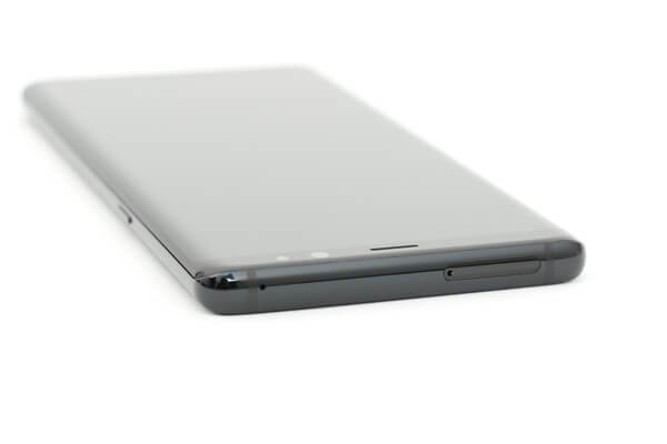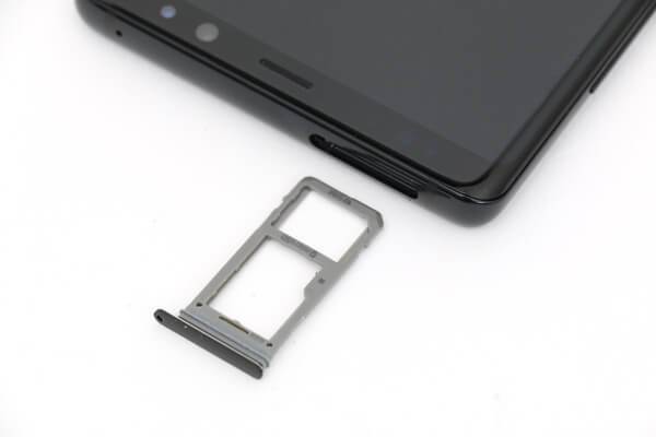 갤럭시노트8의 상단부에는 두 개의 절연띠 사이에 유심 트레이와 마이크 홀이 자리잡고 있다. 유심 트레이는 유심과 마이크로SD를 동시에 장착하는 구조이다.