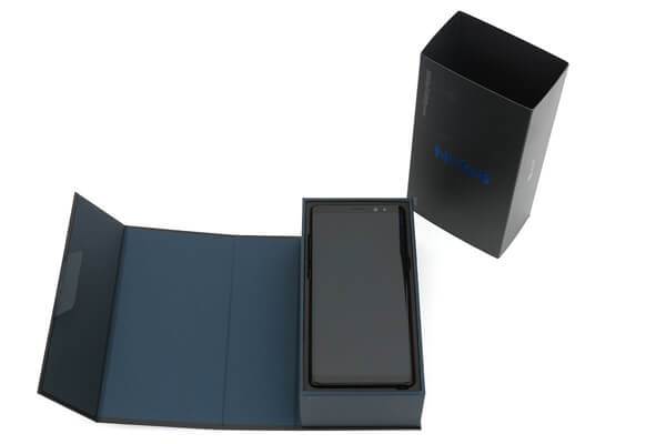 박스를 열어보면 상당히 고급스러운 느낌을 받게 된다. 박스 안쪽면은 살짝 반짝이는 어두운 파란색으로 되어있고, 갤럭시노트8 본체를 꺼내면 그 아래로 구성품들이 가지런히 들어있다.