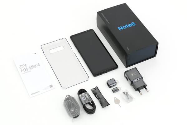 구성품으로는 갤럭시노트8 본체와 투명 하드 보호케이스, 간단 사용 설명서, 충전용 AC 어댑터, 충전 케이블, 번들 이어폰, 여분의 이어팁, 표준 USB – 타입C 변환 어댑터, 마이크로USB – 타입C 변환 어댑터, 유심 추출핀, 여분의 펜팁과 펜팁 제거도구로 이루어져 있다.