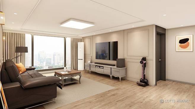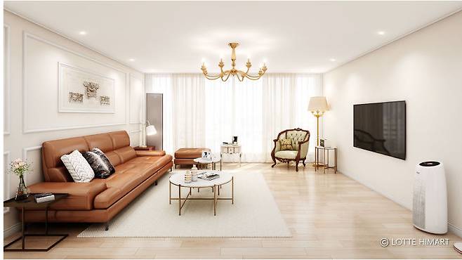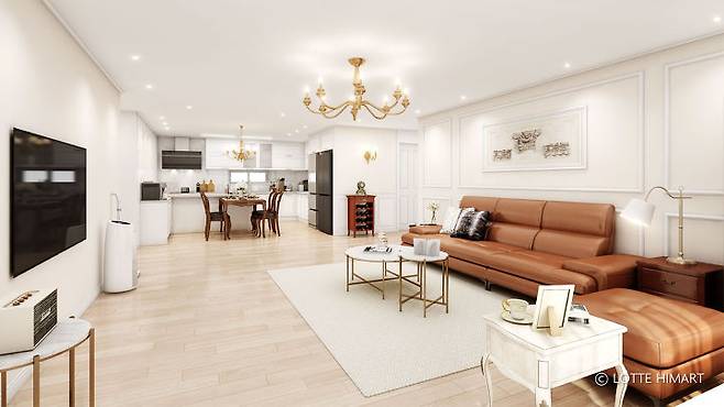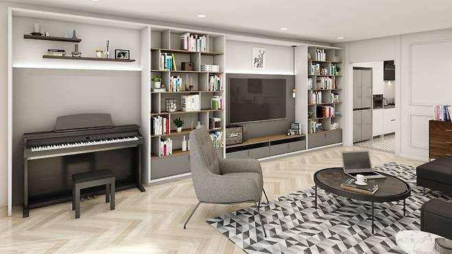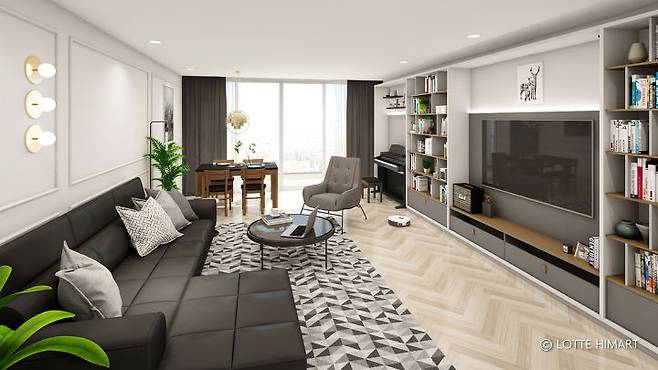 무채색을 기본으로 한 인테리어에 웨인스코팅 벽을 포인트로 넣고, 가죽 소파를 거실 중간에 배치해 유럽 스타일의 우아한 클래식 스타일을 강조했어요.