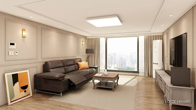 베이지 톤으로 현대적이면서도 클래식한 느낌의 거실이에요. 도시적인 인테리어와 웨인스코팅 벽이 만나니 고전적인 느낌을 벗어나 세련된 느낌이 들죠?