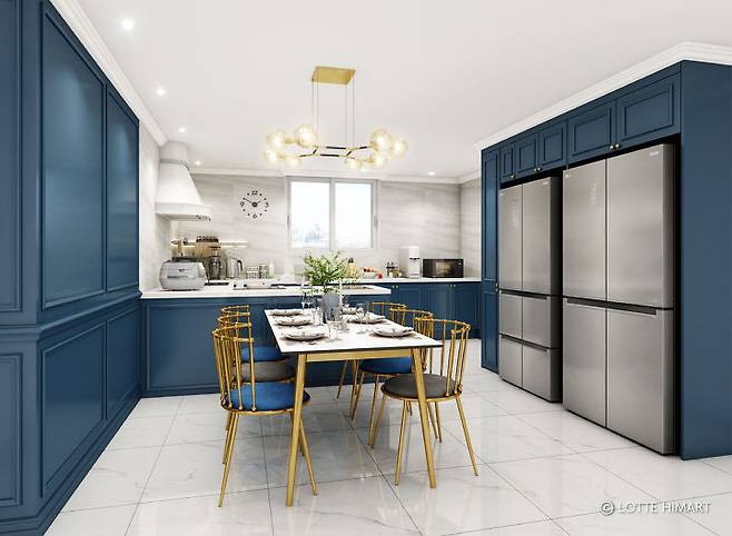 컬러 매치가 돋보이는 이 공간은 블루 컬러의 웨인스코팅을 이용해 프렌치 모던 스타일을 완성한 주방입니다.
