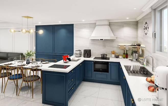 전체 베이스 벽면은 화이트로 주방공간만 남색의 웨인스코팅을 더해 공간 분리효과를 주었어요, 벽면과 주방 싱크대, 빌트인까지 블루 계열의 웨인스 코팅으로 고급스러움이 물씬 느껴져요.