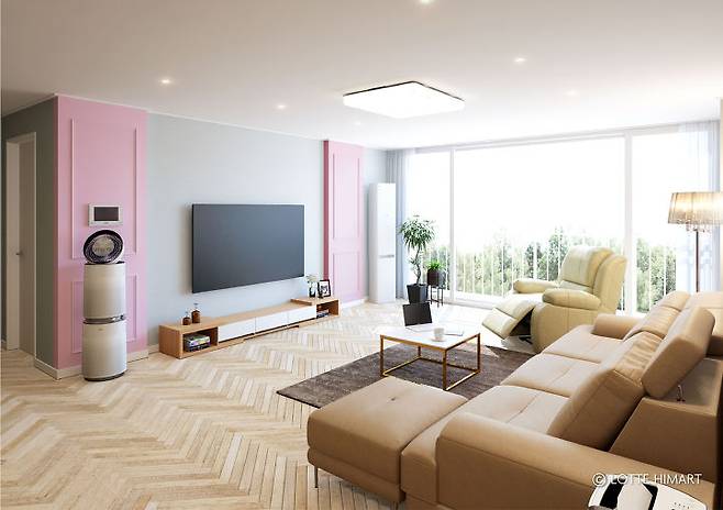 천장이 높고 아무 포인트 없이 설정해 개방감을 살린 이 거실은 밝은 핑크 컬러와 웨인스코팅 벽 디자인을 매치해 개성 있는 모던 인테리어가 무엇인지를 제대로 보여주고 있어요.