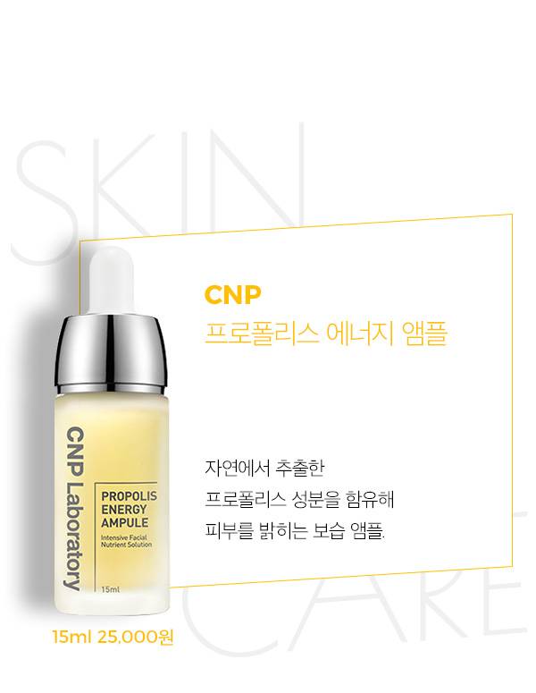 CNP의 대표 베스트 셀러인 프로폴리스 앰플은 올리브영에서 2017년 에센스 부문 총 판매량 1위를 했을 정도로 인기가 많아요. 소비자가 믿고 구매하는 앰플이죠. 처음 출시했던 15ml의 용량이 아쉽다는 요청이 많아 대용량인 35ml도 출시하게 됐죠. 인기에 힘입어 프로폴리스 미스트, 마스크 팩, 파운데이션, 쿠션 등 같은 라인에서 많은 제품이 파생됐답니다.