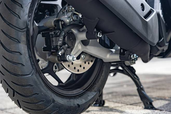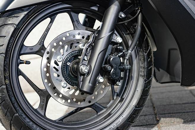 PCX 125는 전방에 1채널 ABS가 적용되어 더욱 과감한 제동이 가능하다. 수치상 프런트 디스크의 직경은 10mm줄어들었으나 제동력은 더욱 뛰어난 느낌이다. 과거 모델은 제동하는 순간 프런트 슬립이 우려되어 과격하게 조작할 수 없었다. 하지만 새로운 PCX 125는 브레이크 레버를 당기는 만큼 일정하게 제동이 되다가 한계에 다다르면 ABS가 빠르게 개입한다. 살짝 젖은 페인트나 과속 방지턱, 대리석 등 미끄러운 곳에서 테스트했을 때 쉽게 자세가 흐트러지지 않았다. ABS가 개입하면서 제동거리가 늘어진 않았는지 확인해보았다. 어린이 보호구역 규정 속도인 30km/h, 도심 규정 속도인 50km/h, 도심 외곽을 기준으로 70km/h의 속도에서 순차적으로 제동하고 거리를 측정했다. 먼저 70km/h의 속도에서 정지 상태까지 26미터 정도의 거리가 필요했으며 리어 브레이크를 함께 사용하면 4미터 가량 제동거리를 줄일 수 있었다. 50km/h에서 정지상태까지 13미터가 필요했고 마찬가지로 리어 브레이크 사용 시 3-4미터가 줄어드는 걸 알 수 있었다. 마지막으로 30km/h에서 제동하면 5미터 이하의 거리만으로 정지할 수 있었다. 테스트 결과만으로는 꽤나 훌륭한 제동력을 확인할 수 있었다.