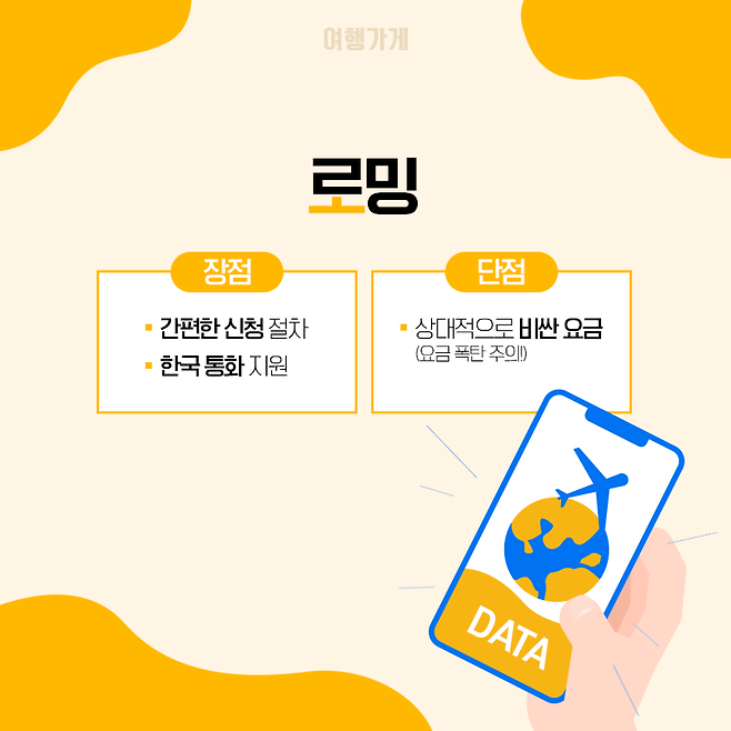 1. 유심이나 포켓 와이파이에 비해 편리한 대신에 요금이 비싸다.