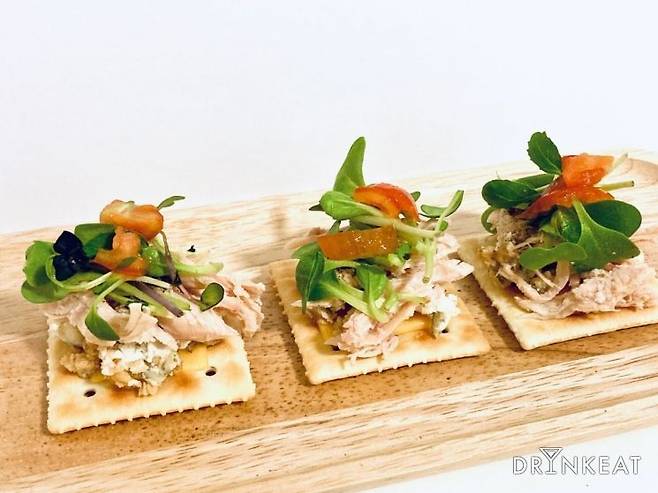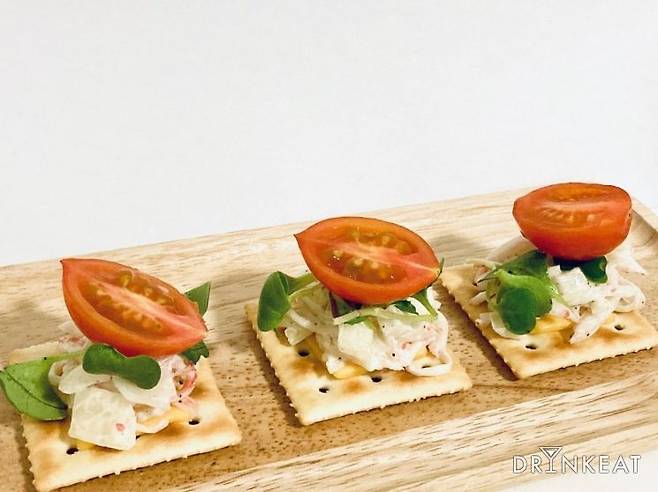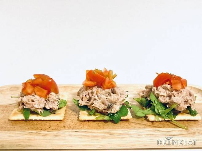 > 마요네즈가 섞여 있어 부드러운 참치마요에 바삭바삭한 크래커, 신선한 무순과 토마토까지! 완벽한 조합의 카나페가 손쉽게 완성되었어요. 참치마요의 짭짤한 맛이 식욕을 자극해 그야말로 술이 술술 들어간답니다.
