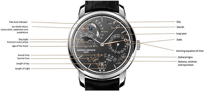 셀레스티아 애스트로노미컬 그랜드 컴플리케이션 3600는 전면 슬레이트 그레이 컬러 다이얼 바탕에 총 15가지 컴플리케이션을 표시합니다. 우측 상단부터 단계별로 그레고리력에 기반한 요일, 월, 윤년, 날짜를 표시하고(퍼페추얼 캘린더), 우측 하단에는 태양시에 근거한 계절, 하지/동지, 춘분/추분, 황도십이궁(조디악 사인)을, 6시 방향에는 일출과 일몰 시간 및 낮의 길이와 밤의 길이를 게이지 타입의 개성적인 인디케이터로 표시하며, 9시 방향에는 클래식한 문페이즈 디스크로 이론상 122년간 별도의 조정이 필요없이 고도로 정확한 문페이즈 디스플레이와 월령 주기, 낮/밤 인디케이터를, 좌측 상단에는 해수면의 조수간만의 차를 보여주는 조류 인디케이터(밀물/썰물)와 태양-지구-달의 합(Conjunction, 태양과 같은 방향에 있게 되는 위치 혹은 시간대)를 각각 표시합니다.