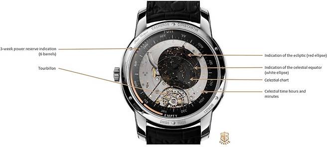 그리고 두 겹의 사파이어 디스크로 구성된 케이스백으로 드러나는 제2의 다이얼로는 우측 전반에 걸쳐 북반구의 셀레스티얼 차트(천체도)와 함께 항성시를 표시하는데, 이때 천체시와 분을 따로 표시하고, 그 위로는 레드와 화이트 컬러로 두 개의 타원(Ellipse)을 표시하는데 이는 황도와 천체 적도를 표시하는 인디케이터 역할을 합니다. 그리고 별자리 아래에 위치한 두 번째 디스크의 가장자리는 항성시와 방위기점을 보여주는 눈금으로 채워져 있습니다. 더불어 세컨 다이얼 6시 방향 하단에는 브랜드의 시그너처인 말테 크로스 형상의 투르비용 케이지를 노출하고, 좌측 테두리로는 3주간의 동력을 표시하는(무려 6개의 병렬 배럴을 사용!) 게이지 타입의 파워리저브 인디케이터가 위치해 있습니다.