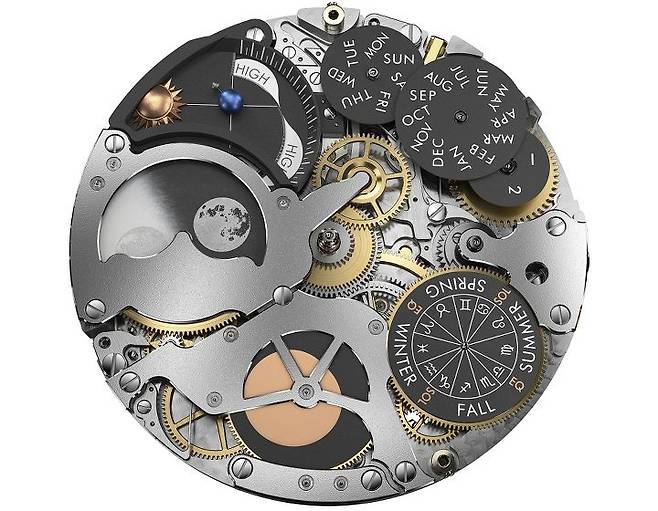 그리고 다이얼 중앙에는 태양 주위를 도는 지구의 궤도를 형상화하고 있는데요. 단지 그 아이디어만 묘사한 수준이 아니라, 별도의 정교한 기어 트레인을 통해 365.2421898일간 태양 주위를 도는 실제 지구의 궤도를 표시하고 있습니다. 여기에 또한 24시간마다 한 번씩 지구 형상이 축을 따라 회전하도록 설계해 나름대로 천문 컴플리케이션을 인상적으로 변주하고 있습니다.