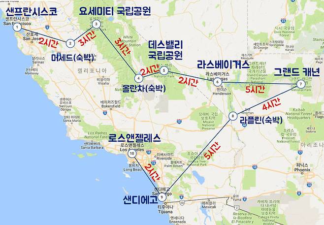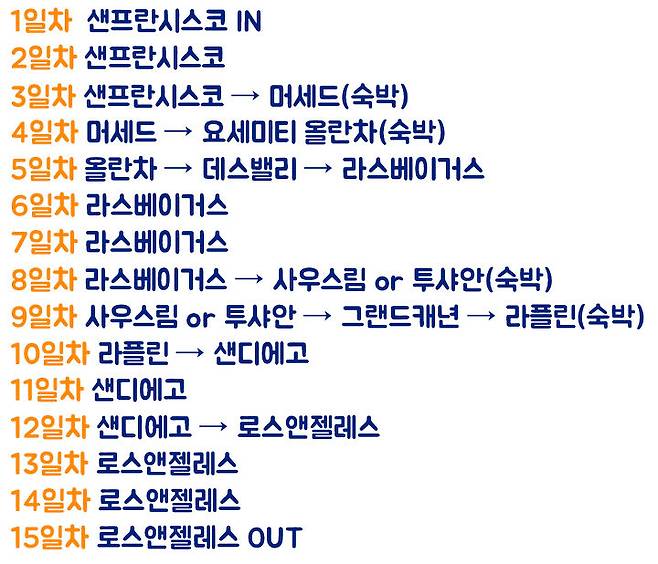 미국 서부 여행은 총 15일! 샌프란시스코 → 요세미티 → 데스밸리 → 라스베이거스 → 그랜드캐년 → 샌디에고 → 로스앤젤레스 이렇게 7곳으로 코스를 짜봤어요.