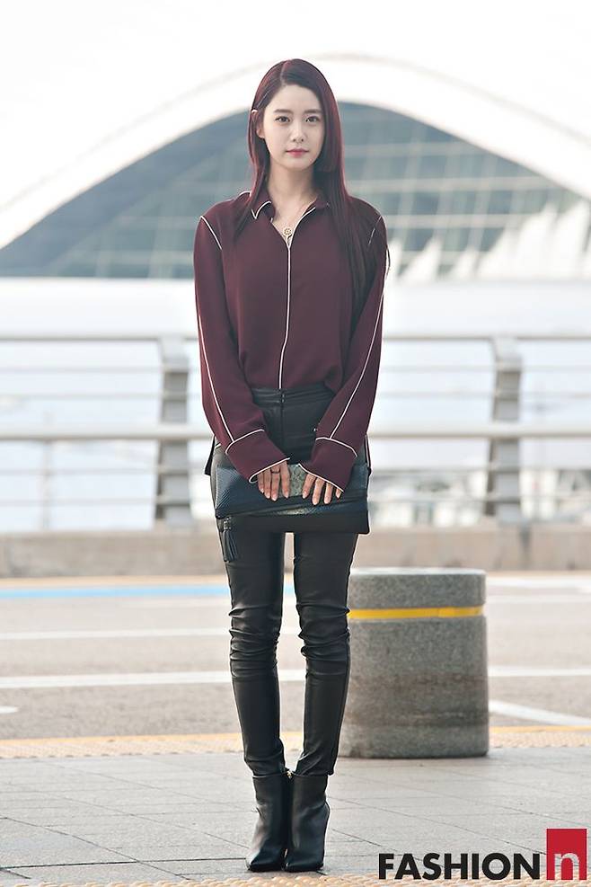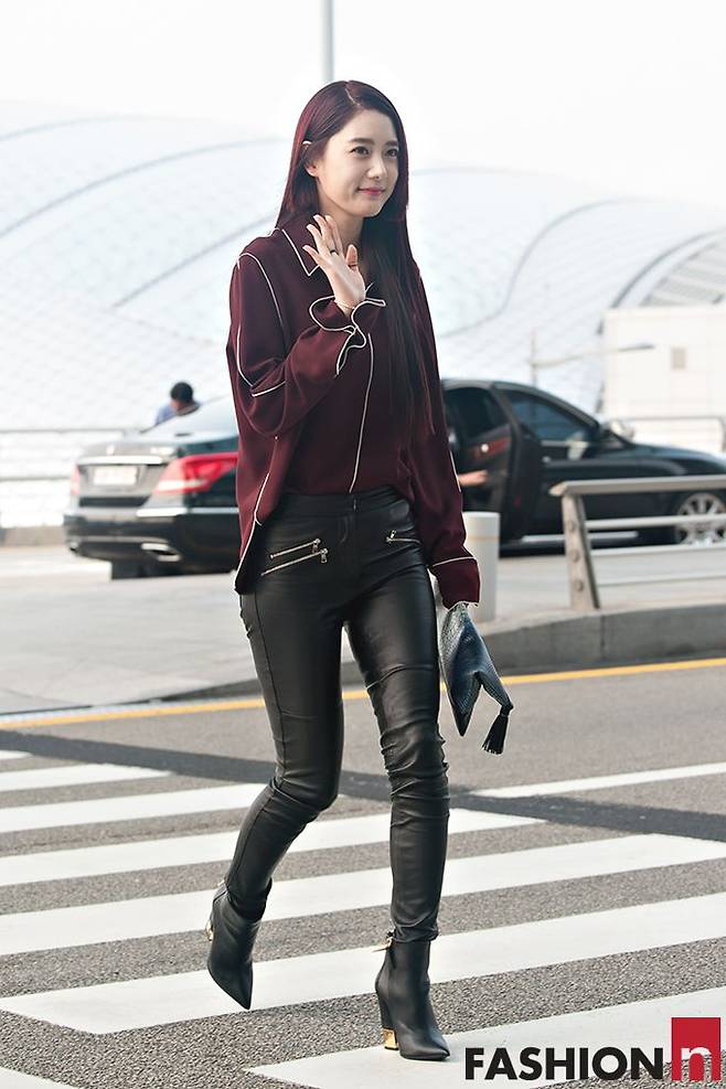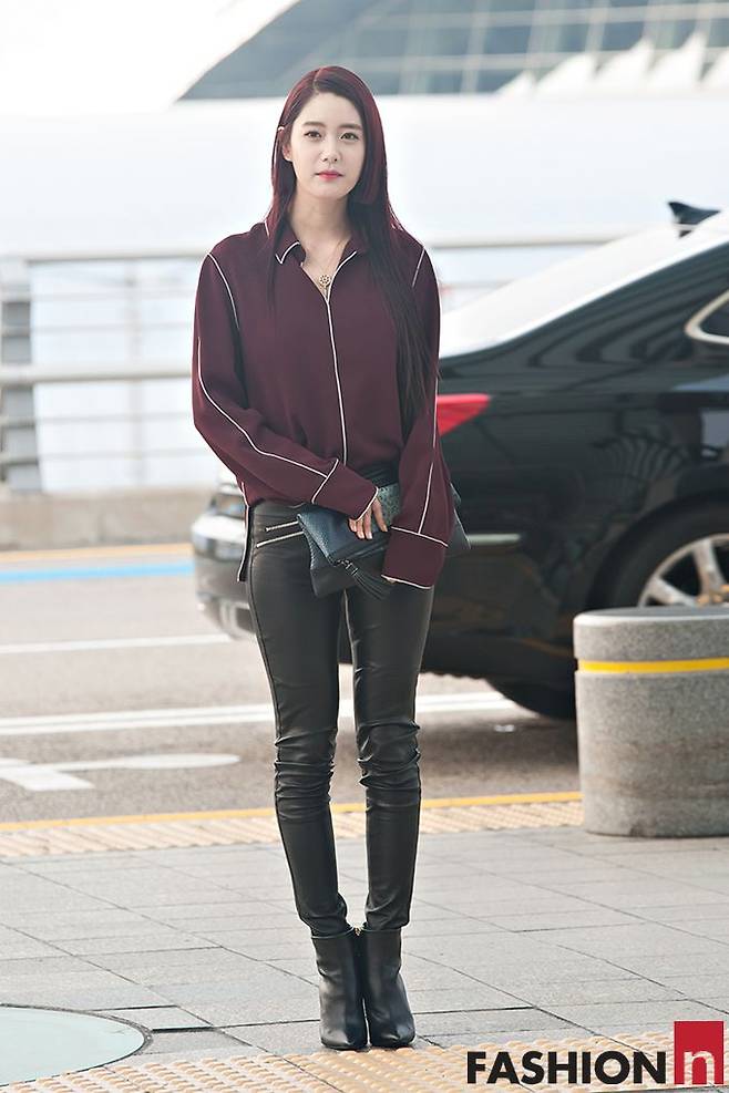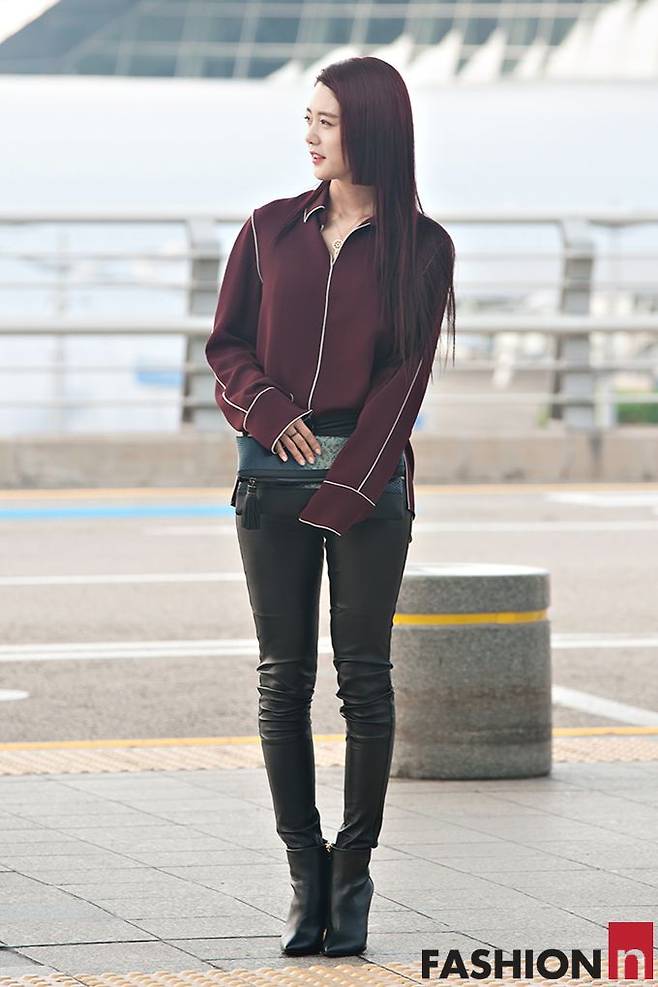 그녀는 블랙 컬러의 레더 스키니를 착용해 각선미를 뽐내며 섹시한 분위기를 연출했으며 독특한 비대칭 스타일의 와인빛 헤어와 컬러를 맞춘 블라우스를 착용해 고혹적인 가을 느낌이 물씬 풍기는 감각적인 공항패션을 완성했다.